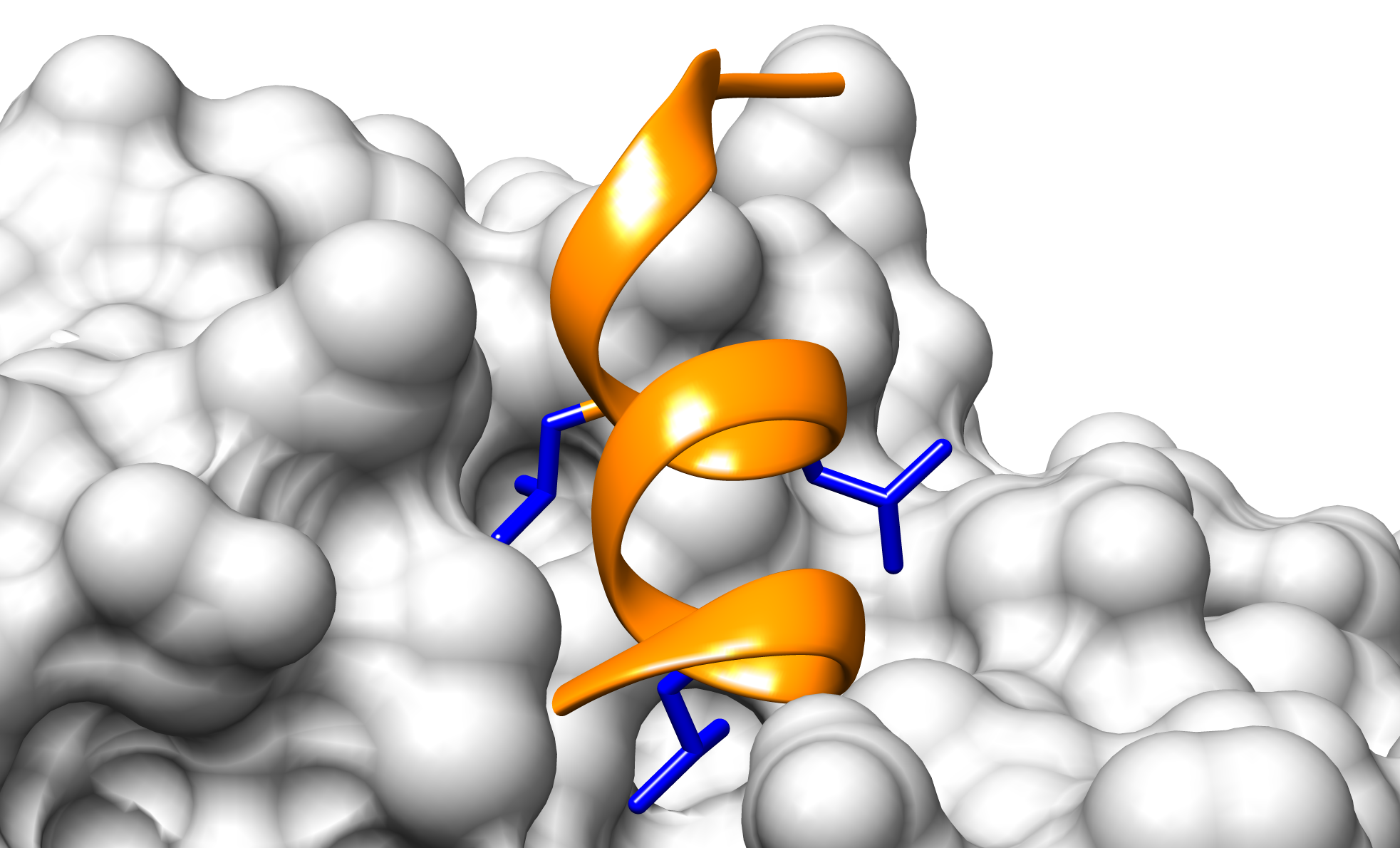 Figura 1. Fragmento de la proteína PGC-1 alfa unido al receptor nuclear PPAR-gamma. Se muestra en naranja el backbone de la proteína representado en Cartoon y en azul las tres leucinas que median la interacción representadas en Sticks (PDB:3CS8) y que conforman el motivo NRBox.