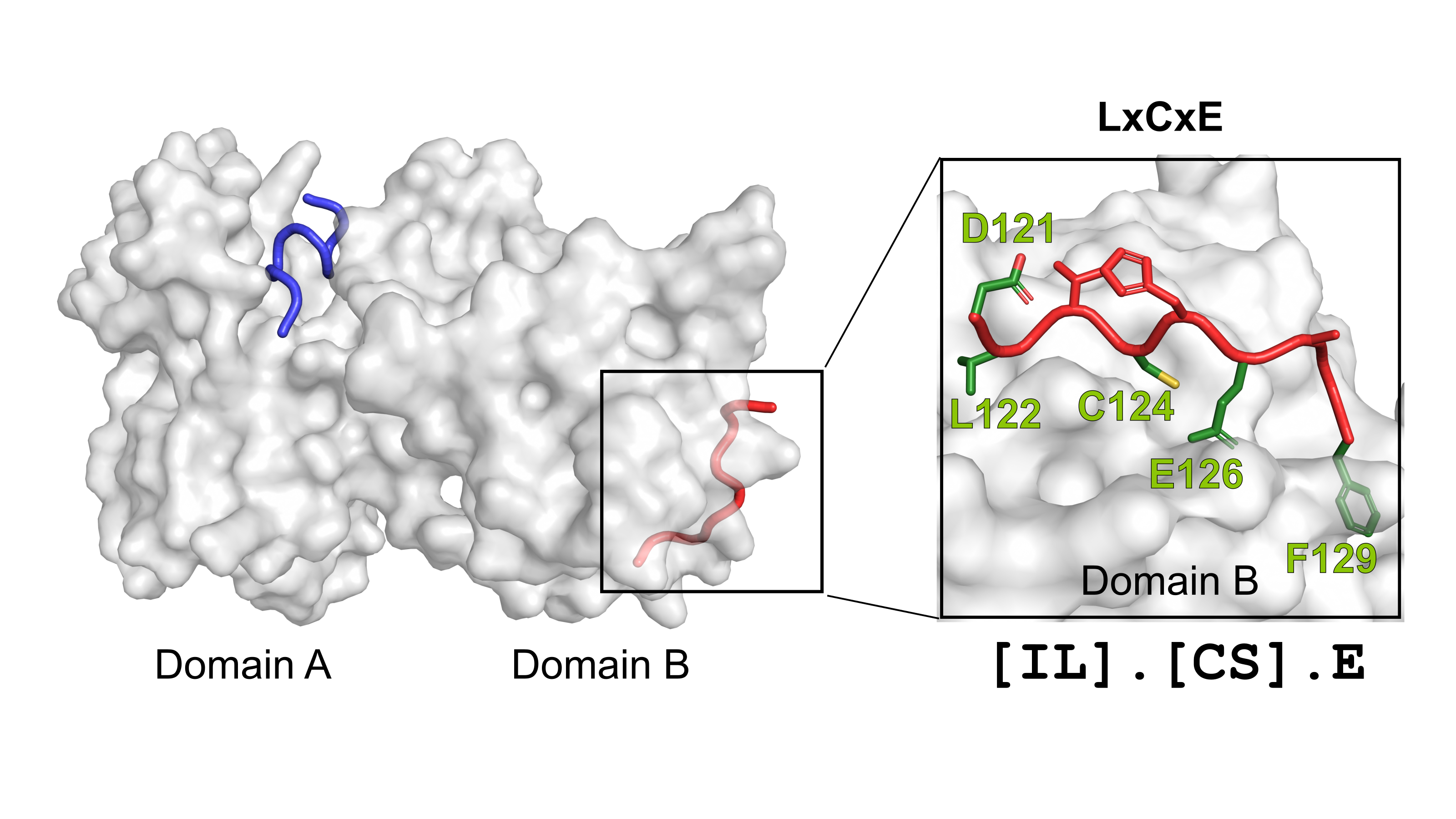 i. La región que media la interacción con Rb forma una hélice. ii. La interacción está mediada por tres residuos hidrofóbicos (F, L, M) que se encuentran en una misma cara de la hélice.